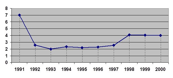 Темпы роста реальных доходов отдельных слоев населения зеркально отображали глубину их предшествующего падения. Наибольшими темпами росли доходы пенсионеров, хотя в 2000 г. они были восстановлены лишь до 82% уровня 1997 г., в то время как средняя зарплата в целом по экономике до 93%[7]