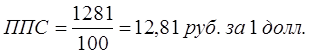 Паритеты покупательной способности валют (ППСВ) представляют собой количество единиц валюты, необходимое для покупки некоего стандартного набора товаров и услуг, который можно купить за одну денежную единицу базовой страны (одну единицу общей валюты группы стран – долларов США, евро, австрийских шиллингов). Например, для покупки в США условной корзины товаров необходимо иметь 100 долл. США. Для покупки той же корзины товаров в 2001 г. в России необходимо было иметь, с учетом покупательной способности российской валюты, 1281 руб. Это означает, что в 2001 г. паритет покупательной способности рубля по отношению к доллару США составил:
