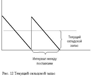 Текущим складским запасом материальных ценностей называют запас, обеспечивающий потребности производства на период между двумя очередными поступлениями их поставщиков (рис. 12).