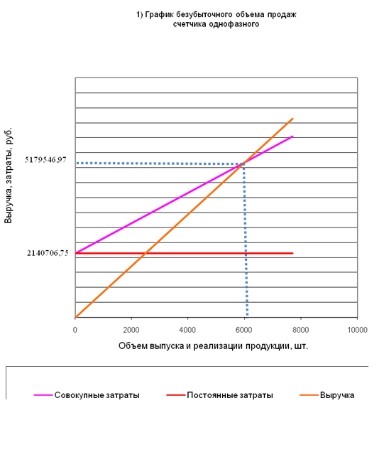 Для расчета оптимального объема выпуска продукции, а также уровня рентабельности продукции предприятия можно использовать график безубыточности, определяющий точку безубыточности. Данная точка на графике определяет тот объем производства изделий, при котором предприятие полностью покрывает расходы на производство и реализацию продукции, т.е. прибыль равна нулю.