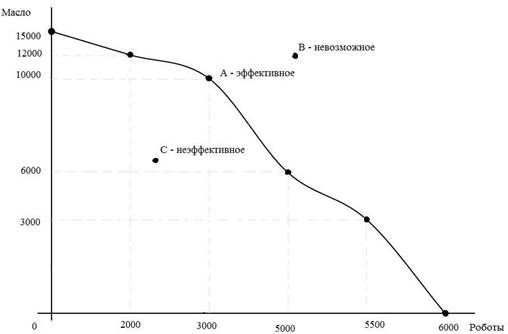 Построить график производственных возможностей. Определить эффективную, неэффективную и невозможную комбинацию двух товаров (масла и роботов).