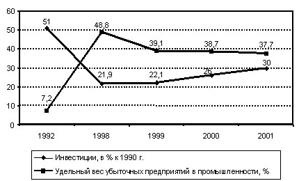 Почти 40% крупных и средних предприятий являются убыточными, уровень инвестиций по сравнению с 1990 г. снизился почти в 5 раз. Износ производственного аппарата предприятий в некоторых отраслях достигает 70% (степень износа основных фондов промышленности на начало 2004 г. достигла 52,4%), а выбытие фондов в 1,5 раза превышает их ввод. Только 10-15% основных фондов в промышленности соответствуют мировому уровню, да и те зачастую не загружены. Объективно оценивая ситуацию, можно утверждать о прогрессирующей деиндустриализации экономики постсоветского периода.