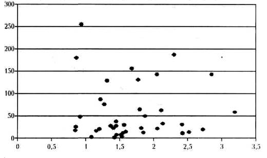 Рисунок 1. Диаграмма рассеяния интенсивности взяток (ось Х) и среднего размера взятки