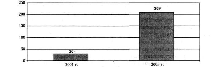 Сопоставим средний размер взятки с количеством квадратных метров жилья, которое можно купить на первичном рынке по среднероссийским ценам (см. рис. 2). Если в 2001 г. можно было приобрести 30 кв. м, то в 2005 г. — 209 кв. м. Таким образом, в абсолютном выражении средний размер взятки увеличился в 13,6 раза, а в относительном — применительно к жилищному рынку — в семь раз. В абсолютном выражении объем рынка деловой коррупции вырос в девять раз, но если соотнести его с выпуском, то примерно в пять раз (это не доля коррупции в выпуске, потому что последний не учитывает коррупцию; здесь выпуск — просто шкала, задающая масштаб).