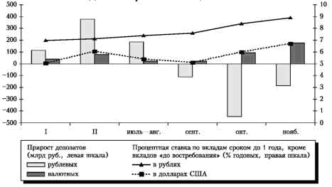 К концу 2008 г. острая, финансово-спекулятивная фаза кризиса была преодолена. В декабре после трехмесячного сокращения (суммарный отток вкладов населения в сентябре-ноябре составил 454,2 млрд. руб.) возобновился приток средств населения в банковскую систему. По предварительным данным, объем депозитов вырос более чем на 800 млрд. руб. за счет сезонного предновогоднего роста доходов, а также переоценки валютных вкладов, отражаемых в российской отчетности в рублях. Подчеркнем, что декабрьский прирост депозитов был связан не столько с колебаниями курсов валют, сколько с возвращением средств населения в банковскую систему.