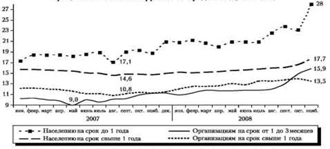 Снижение доступности заемных средств для населения и организаций привело к замедлению динамики их кредитования. Так, ноябрьское увеличение задолженности нефинансовых организаций перед банками (на 0,8%) оказалось минимальным с марта 2006 г. (на 0,6%), а среднемесячная динамика кредитов в сентябре-ноябре замедлилась в 2,4 раза - до 1,3% против 3,1% за первые восемь месяцев 2008 г.