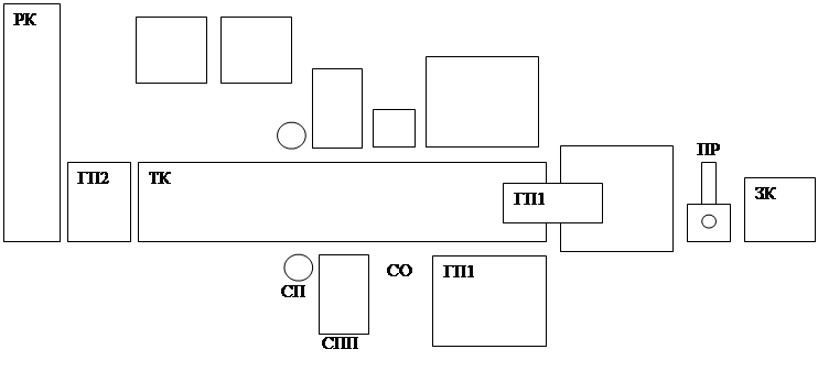 Загрузочный конвейер (ЗК) - > Моечная машина (ММ) - > Технологический конвейер (ТК) - > Кантователи (К) - > Гидравлический пресс (ГП1) - > Монорельс (М) - > Стенд для обрезки крышек (СО) - > Стол для постановки и приварки деталей (СПП) - > Гидравлический пресс (ГП2) - > Сварочный пост (СП) - > Электрогорн (ЭГ) - > Клепальная установка (КУ) - > Разгрузочный конвейер (РК) - > Комплектовочная тележка (КТ).