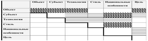 На рис. 3 диагональной штриховкой отмечена выявленная в процессе исследования содержания видов менеджмента взаимосвязь следующих пар критериев классификации видов менеджмента: объект управления – объект управления, объект управления – субъект управления, объект управления – технология управления, объект управления – цель управления, субъект управления – национально-культурные особенности управления, стиль управления – национально-культурные особенности управления.