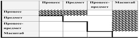 Целый спектр объектов управления состоит из неотделимых друг от друга процессов, материальных и нематериальных предметов. Таковыми являются все социально-экономические системы, а следовательно, организации, предприятия, объединения, государственными органы. Такие объекты рассматриваются в административном менеджменте, государственном управлении, инновационном менеджменте, корпоративном управлении, менеджменте организации, управлении экономикой и др. Таким образом, критерий объекта управления имеет структурированную иерархию, где процесс и предмет, как объекты управления, являются критериями двухмерного пространства классификации (рис. 2).