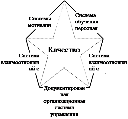 В основание звезды качества положим ту или иную систему управления качеством, соответствующую определенной концепции. Будем предполагать, что система эта документирована и охватывает организационную структуру управления предприятием, а также систему управления процессами создания продукции. Последнее очень важно подчеркнуть: мы рассматриваем организацию и как функциональную структуру, и как совокупность процессов.