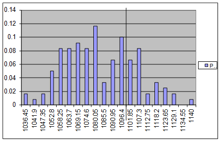На основании контрольного листка строится гистограмма (рис. 1). Для того чтобы построить гистограмму необходимо на оси абсцисс отметить интервалы, а по оси ординат частоты и столбиками отметить полученную частоту в каждом интервале.
