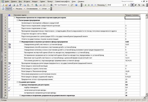 В межах дослідження розроблена програма проекту із використанням можливостей MS Project 2003, що дозволить у майбутньому більш ефективно реалізувати проектний задум, розроблені завдання та управлінські функції за проектом більш ефективно та забезпечити результативність функціонування нового ресторану.