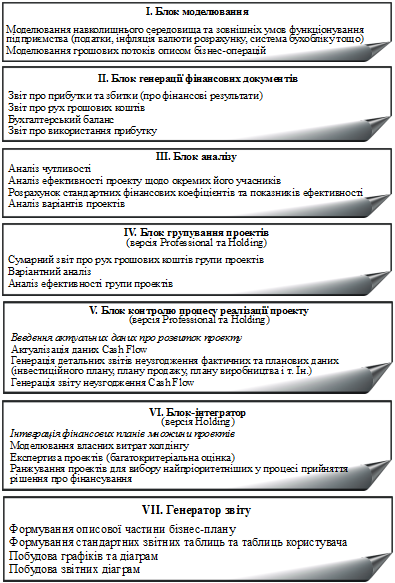 значно відрізняється від перелічених вище продуктів. Системність у рішенні багатьох проблем, урахування специфіки національних умов, потужна рекламна кампанія робить заявку цього програмного продукту на лідерство в даній галузі досить вагомою. Пакет рекламується як засіб підготовки бізнес-планів міжнародного зразка і до певної міри відповідає меті, що декларується.