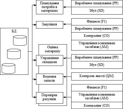 Модуль управління матеріальними потоками (ММ) на підприємстві призначений для розв’язання широкого кола задач починаючи з планування потреби в матеріалах, їх заготівлі і завершуючи контролінгом і складанням звітності. Модуль ММ тісно пов’язаний з іншими модулями системи R/3, що показано на рис. 1.