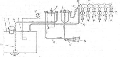 1 — топливозаборная трубка; 2 — топливный бак; 3 — наливная горловина; 4, 9, 11. 13, 15 и 16 — топливопроводы; 5 — датчик указателя уровня топлива в баке; 6—указатель уровня топлива в баке; 7 — фильтр грубой очистки топлива; 8 — фильтр тонкой очистки топлива; 10 — штуцер с дроссельным отверстием; 12 - насос-форсунка; 14 — топливоподкачивающий насос