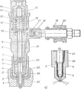 Форсунку на дизеле устанавливают в латунный стакан 24 головки 25 блока. Под торец накидной гайки 5 крепления распылителя установлена медная шайба 2, предотвращающая прорыв газов. Каждая форсунка укреплена скобой, имеющей лапки, которые опираются на буртик колпака 15. В месте соединения штуцера 20 форсунки с головкой блока и колпаком головки установлен резиновый уплотнитель 19. Накидная гайка 5 прижимает тщательно притертые поверхности торцов распылителя и корпуса 8 форсунки, обеспечивая необходимую герметичность соединения. Внутри корпуса форсунки проходит штанга 9, на верхнем конце которой закреплена тарелка 10. Пружина 11, упираясь одним концом в винт 12, а другим в тарелку 10, через штангу 9 прижимает иглу 1 к распылителю. В штангу с нижней стороны запрессован шарик 7 для плотной посадки иглы на седло. Винт 12 ввернут в стакан 13 пружины, закреплен от самоотвертывания контргайкой 14 и закрыт колпаком 15. В корпус 8 форсунки запрессовано два штифта 6 для правильной установки распылителя.
