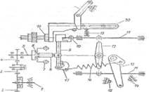 На оси 17 установлены силовой 26 и двуплечий 18 рычаги. Рычаг 18 пружиной 19 соединен с рычагом 9, закрепленным на одном валу 8 вместе с рычагом 14 управления регулятором. Последний в свою очередь связан тягой с педалью, находящейся в кабине водителя. Силовой рычаг 26 соединен с нижними отверстиями серьги 24 отдельным пальцем.