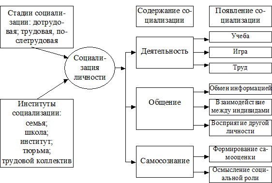 Личность не может находиться вне общества, коллектива, группы, она утверждается в группе, реализуется. Процесс адаптации индивида к социальной среде называется социализацией личности. Социализация – это процесс становления личности при помощи общения и усвоения индивидом норм, ценностей, установок, присущих данному коллективу, группе, обществу (рис.7).