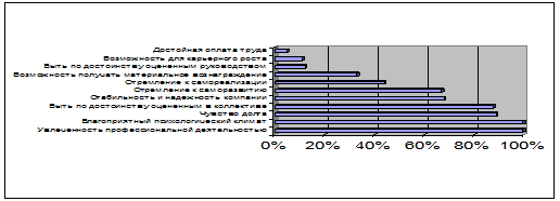 Из данного рисунка очевидно, что одним из приоритетных мотивов стимулирующих творческий потенциал каждого сотрудника является, прежде всего, увлеченность сотрудника своим делом, а также микроклимат компании, стабильность ее деятельности на рынке.
