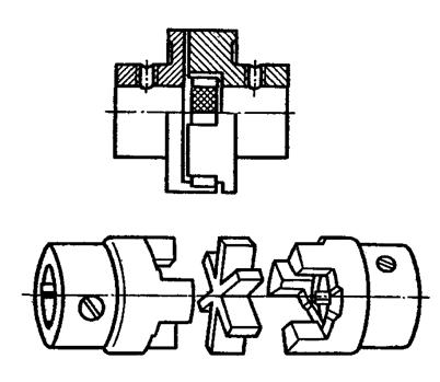 з центральним отвором, встановлений на пальцях між напівмуфтами. У спряжених пальців з пружним диском виникають циклічні навантаження від обертального моменту і перекосу валів, що обумовлює низький ресурс, а при перевантаженнях, як і в першому рішенні, вихід муфти з експлуатації.