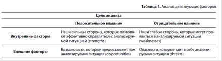 SWOT-анализ проводят в два этапа: 1) анализ действующих факторов (табл. 1);