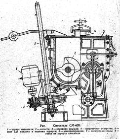 (Рис. 2) Смеситель СМ-3: 1 — корпус смесителя; 2 — лопасти; 3 — откидная крышка; 4 — загрузочное отверстие; 5 — винт для наклона и подъема корпуса; 6 — электропередача; 7 — электродвигатель; 8 — гайка корпуса смесителя