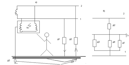 Рис. 2 – Схема захисного заземлення 2х провідної мережі: а) електрична схема; б) схема заміщення.