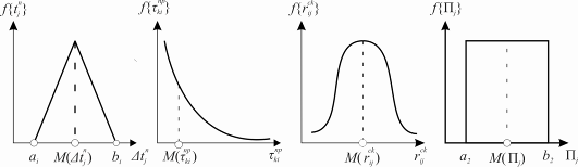 Для кожної операції (складання, контролю якості) накопичується статистичний матеріал про зміну їхніх тривалостей у часі (наприклад, шляхом хронометражу робочого часу). На підставі наявних дослідних і довідкових даних установлюються детерміновані в часі показники процесу складання і ймовірних діапазонів їх зміни: тривалість підготовки до операції , інтенсивність перевірки якості деталей , ймовірність появи браку деталей та ін. Накопичений статистичний матеріал представляється в компактній, зручній для сприйняття ЕОМ формі: установлюються закони розподілу (рис. 3), визначаються їхні числові характеристики.