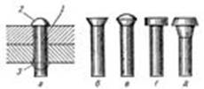 Рис. 1. Распространённые типы заклёпок: а — с полукруглой головкой; б — с потайной головкой; в — с полупотайной головкой; г — с плоской головкой; д — коническая с подголовком; 1 — стержень заклёпки; 2 — закладная головка; 3 — замыкающая головка.