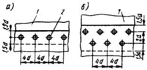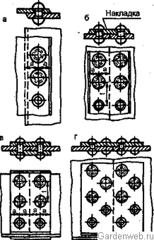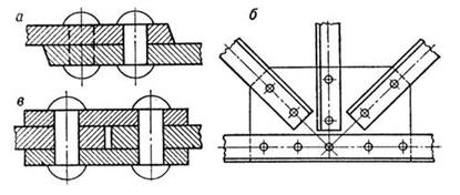 Заклёпочные соединения: а — внахлёстку двухрядным швом; б — встык с одной накладкой; в — встык с двумя накладками однорядными швами.