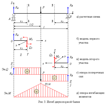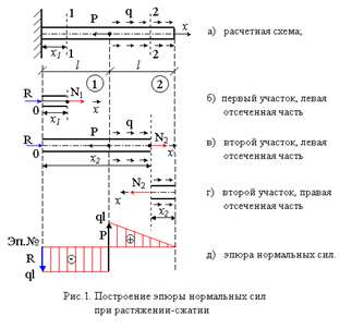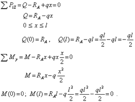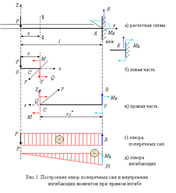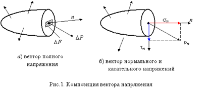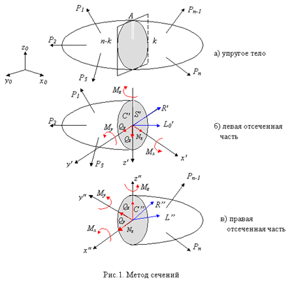 Мысленное разрезание бруса на две части произвольным сечением А (рис.1 a), приводит к условиям равновесия каждой из двух отсеченных частей (рис.1 б,в). Здесь {S'