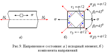 = ± действуют на площадках, наклоненных .коси стержня под углами ±45°; главное напряжение 2