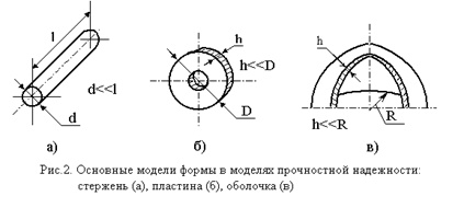 Основными моделями формы в моделях прочностной надежности, как известно, являются: стержни, пластины, оболочки и пространственные тела (массивы) (рис.2). Модели нагружения содержат схематизацию внешних нагрузок по величине, характеру распределения (сосредоточенная или распределенная сила или момент), а также воздействию внешних полей и сред.