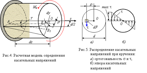 Выведем формулу для касательных напряжений при кручении призматического стержня кругового поперечного сечения. Как видно, поворот правого торцевого сечения относительно неподвижного левого на угол j (назовем его углом закручивания стержня) вызывает поворот продольных волокон на угол (угол сдвига), поскольку на величину искажаются углы ортогональной сетки продольных и поперечных рисок модели. Двумя смежными сечениями вырежем элемент стержня длиной dz