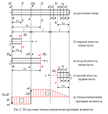 принят положительным. Численно крутящий момент равен сумме моментов внешних сил, приложенных к отсеченной части стержня, относительно оси Оz