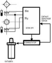 Найбільш сучасна схема. Так названа "схема з розподіленими котушками запалювання". Дозволяє позбутися від таких ненадійних елементів, як кришка розподільника запалювання, "бігунка", проводів високої напруги, і т.д. Але за все у житті потрібно платити, і застосування цієї схеми вводить один ненадійний елемент, як котушка запалювання. Але не будемо забігати вперед, основні несправності нас чекають в переді.