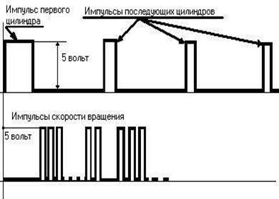 Верхній (за схемою) датчик дає команду блокові EFI на "подачу" іскри, нижній подає інформацію про швидкості обертання двигуна в даний момент. Епюри напруг на обох датчиках виглядають так: