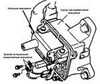 Треба сказати, що в основному такі розподільники першими почали застосовуватися на автомобілях "Mazda", "Honda", "Mitsubishi" і деяких інших. На малюнку показаний от такий "складний розподільник запалювання" фірми "Honda", що, у принципі, по своїй будові мало чим відрізняється від подібних розподільників інших відомих фірм. Він, до речі, і кріпиться в такий же спосіб, як і показано на малюнку - "боком".