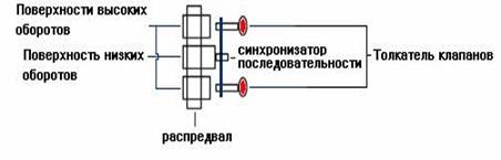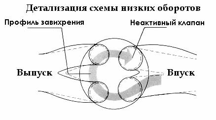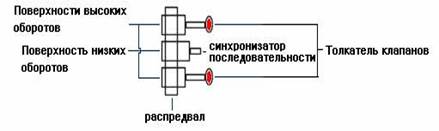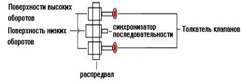 Під час роботи на низьких оборотах, два зовнішніх кулачки безпосередньо пускають у хід два штовхача. Ці низкооборотні кулачки оптимізовані для плавного прийому і низької витрати палива. Високооборотний кулачок пускає в хід послідовник. Але так як послідовник не зв'язаний ні з чим, то це ні до чого не приводить. Цей процес ілюстрований малюнком.