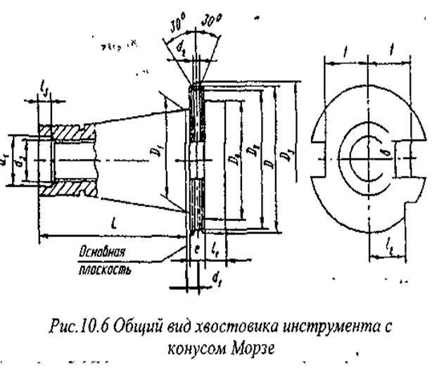 Для закрепления режущих инструментов применяется сборный вспомогательный инструмент, разделенный на элементы, соединяемые между собой поверхностями, обеспечивающими удобное и быстросменное крепление. Соединение режущего и вспомогательного инструмента осуществляется посредством цилиндрических и конических хвостовиков (конус Морзе), а вспомогательного инструмента со шпинделем — с помощью хвостовиков с конусностью 7:24. Номенклатура конусов 7:24 предусматривает следующие типоразмеры: 30,40,45,50, 55,60. Наибольшее применение находят хвостовики с конусом 40 и 50 (рис. 4).