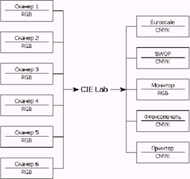 С помощью CIELab оказалось возможным построить систему управления цветом (Color Management System - CMS) для всех устройств независимо от того, являются они устройствами ввода или вывода (рис. 3).