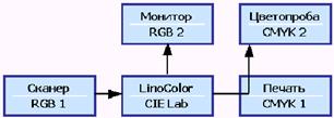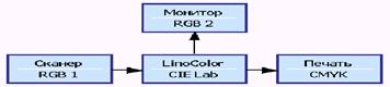 Одним из первых программных продуктов, использующих эту модель в качестве внутреннего цветового пространства, стал LinoColor 3.0 фирмы Linotype-Hell, предназначенный для сканирования и обработки изображений. Рассмотрим на примере этой программы принципиальную схему использования пространства CIELab в качестве внутреннего пространства, считающуюся в настоящее время классической. Программа LinoColor получает RGB-данные со сканера и трансформирует их в пространство CIELab. Для представления на экране монитора Lino-Color трансформирует CIELab в пространство монитора RGB. Для вывода на фотонаборный автомат или цифровую цветопробу выполняется трансформация в пространство CMYK печатного процесса (рис.4).