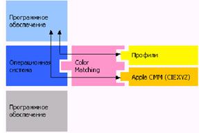 Несомненно, что самым большим прорывом в возможности управления цветом стала система ColorSync фирмы Apple (или Color Matching Methods (CMM) - методы цветового согласования, как их называет сама фирма). ColorSync работает на уровне операционной системы, что означает поддержку управления цветом для всех программ независимо от того, ориентированы они на работу с растровой либо векторной графикой или на верстку. Система предусматривает присутствие так называемого Plug-In port (порта для самонастраиваемых модулей), предназначенного для профилей устройств. По терминологии Apple профиль (profile) - это файл, описывающий цветовые характеристики устройства, к которому при работе обращается та или иная программа для корректного отображения того или иного изображения. С помощью ColorSync обеспечивается цветовая трансформация для всех устройств. Например, программа может запросить выполнить процедуру трансформации цветов, полученных на сканере “а”, в цвета монитора “b” и наконец в цвета принтера “с”.