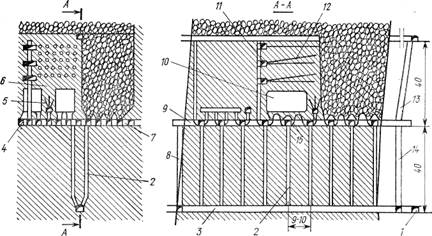 Очистные работы начинают с подсечки, после выпуска руды из которой образуются горизонтальные компенсационные пространства (камеры) 10.
