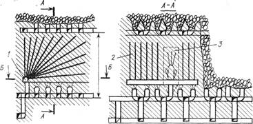 . Доставка отбитой руды производится скрепером в рудосвалочные восстающие. При применении системы подэтажного обрушения также с отбойкой наклонных слоев руды на наклонную подсечку (см. рис.26.16,6) разбуривание массива производится непосредственно из выработок горизонта доставки (скреперования) 3.