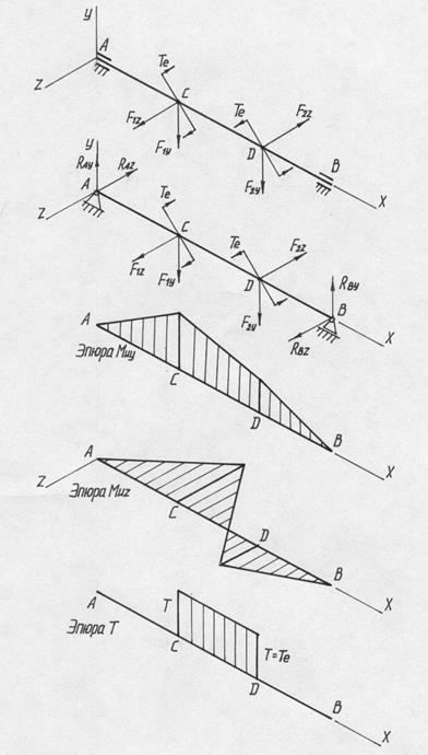 Используя принцип независимости действия сил, строим эпюры изгибающих моментов от вертикальных (рис. 1, в) и горизонтальных сил (рис. 1, г), а также эпюру крутящих моментов (рис. 1, д). Сравнивая построенные эпюры, видим, что наиболее опасным является сечение, проходящее через точку С