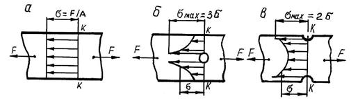 – площадь поперечного сечения полосы. При наличии в пластине отверстия (рис. 2, б) или выточки (рис. 2, в) распределение напряжений изменяется: у краев отверстия и выточки напряжения максимальны (σmax