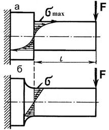 при резком изменении размеров поперечного сечения (рис. 3, б); прорези заменять полукруглыми выточками; увеличивать радиусы закруглений галтелей и выточек; круглые отверстия заменять эллиптическими, вытянутыми вдоль оси стержня; необходимые отверстия располагать в зоне пониженных напряжений и т.д.