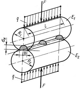 По контактным напряжениям рассчитывают фрикционные и зубчатые передачи, элементы кулачковых механизмов. Определение контактных напряжений при малых размерах площадок контакта для тел различной конфигурации (контактная задача) рассматривается в теории упругости. Расчет базируется на следующих допущениях: в месте контакта возникают только упругие деформации; поверхности соприкасающихся тел идеально гладкие, и силы давления, распределенные по площадке контакта, нормальны к поверхности контакта; на площадке контакта возникают только нормальные напряжения. При размерах площадок контакта, малых по сравнению с общей поверхностью соприкасающихся тел, для определения контактных напряжений используют зависимости, полученные Г. Герцем. Напряжения в месте контакта зависят от геометрии соприкасающихся тел. Приведем без вывода расчетные формулы для случая сжатия двух цилиндров (рис. 4) с радиусами R