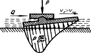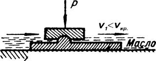 На рис. 3 показаны две плоские пластины А и Б, залитые маслом и нагруженные силой Р. Под действием силы О пластина А движется относительно пластины Б со скоростью υ. Если последняя мала (рис. 3, а), то пластина А соскабливает масло с пластины Б, в результате чего поверхности трения (А и Б) непосредственно соприкасаются друг с другом. При этом образуется полусухое (граничное) или полужидкостное трение При достаточно большой скорости v (рис. 3, б) пластина А поднимается в масляном слое и принимает наклонное положение, подобно тому как поднимается глиссер, скользящий по поверхности воды. В результате между пластинами образуется сужающийся зазор, в который непрерывно затягивается вязкое и липкое масло. Протекание масла через сужающийся зазор сопровождается образованием давления р (см. рис. 3, б), которое уравновешивает внешнюю нагрузку. В этом случае движение продолжается в условиях жидкостного трения. Переход к режиму гидродинамического трения происходит при некоторой скорости, называемой критической υкр